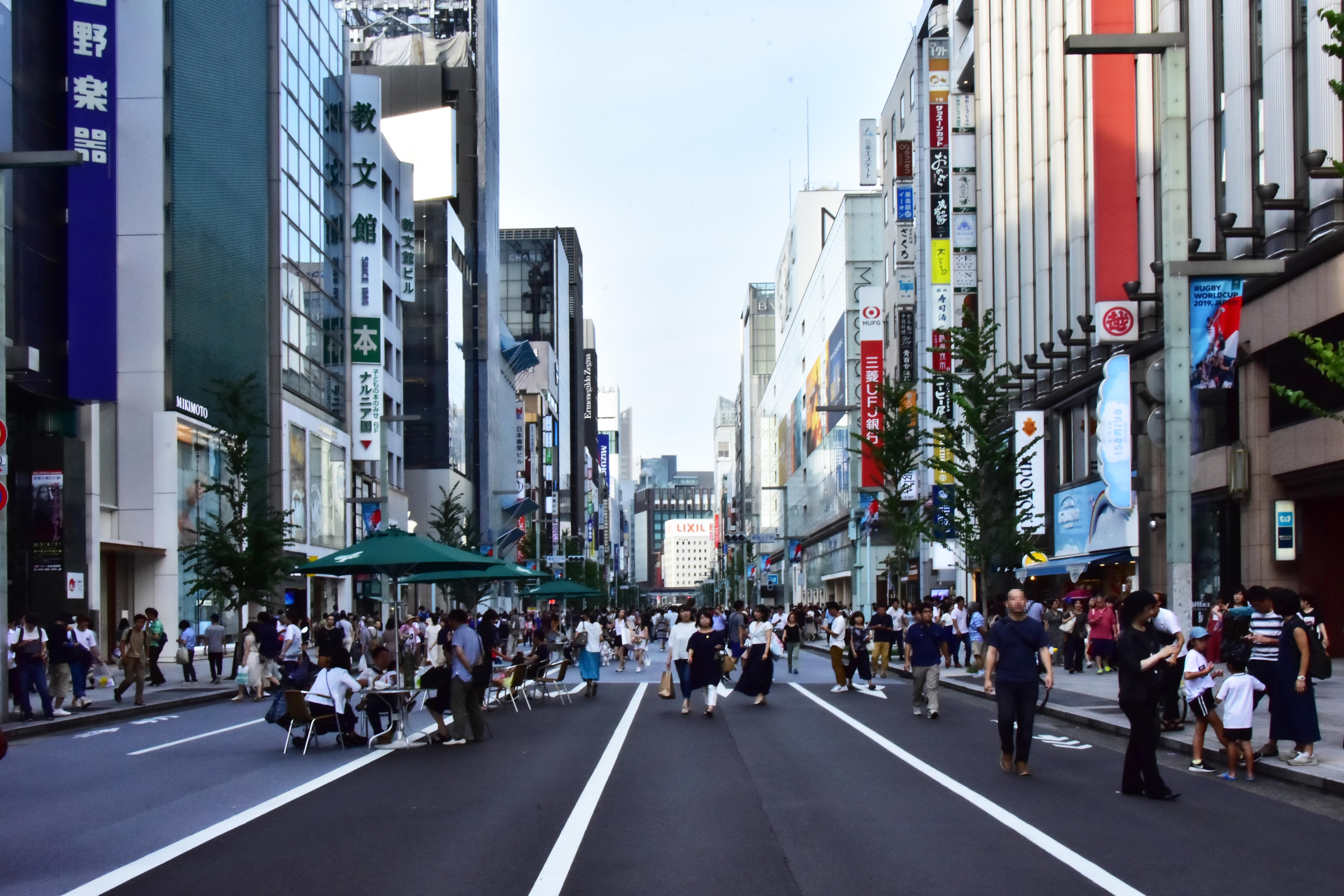 銀座的【步行者天國】實行的歷史可追溯回1970年,為了讓人群能夠更輕鬆自在地於街道上購物而展開。街道上還放置了不少座椅,逛累了還能坐下來小歇休息哦!