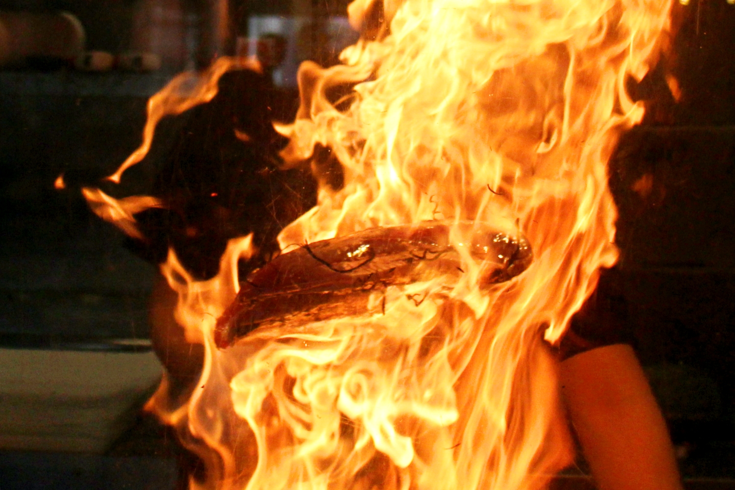 師傅會看準火侯,再將烤好的鰹魚切成厚片,切開瞬間,才讓人驚覺裡頭的肉質,竟還呈現鮮嫩粉色的生魚片狀態。這其實就是選用稻草來炙燒的原因。稻草的燃點低又帶有清新香氣,點燃後既能瞬間提高溫度、去腥,讓鰹魚外皮迅速被烤得酥熟,還可讓內裡的魚肉保持新鮮,一外一裏的脆嫩口感,便成就了料理的美味關鍵。最後將鰹魚抹上鹽巴,搭配洋蔥絲、蒜片,或是沾上高知在地的柚子醋享用,過癮程度絕對讓人想高舉右手大喊一句「麻煩追加一杯生啤酒」。